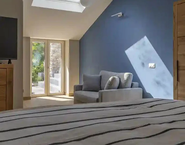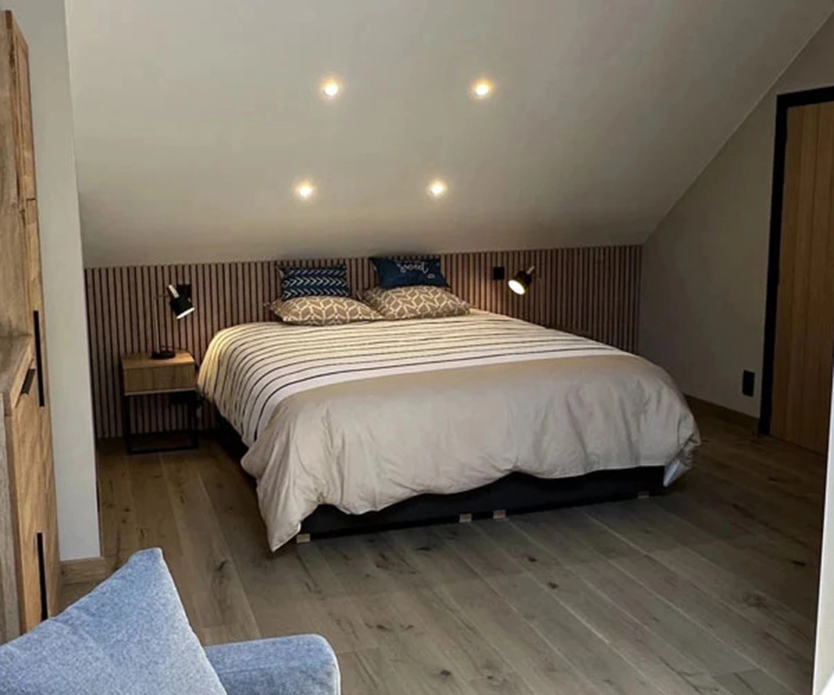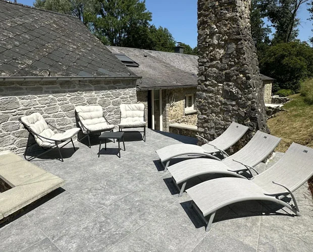 La chambre Chimay Bleue s’ouvre sur une petite terrasse privative, parfaite pour savourer un moment de calme. Équipée de transats, elle invite à la détente au grand air, le temps d’un café le matin ou d’une pause lecture en fin de journée.